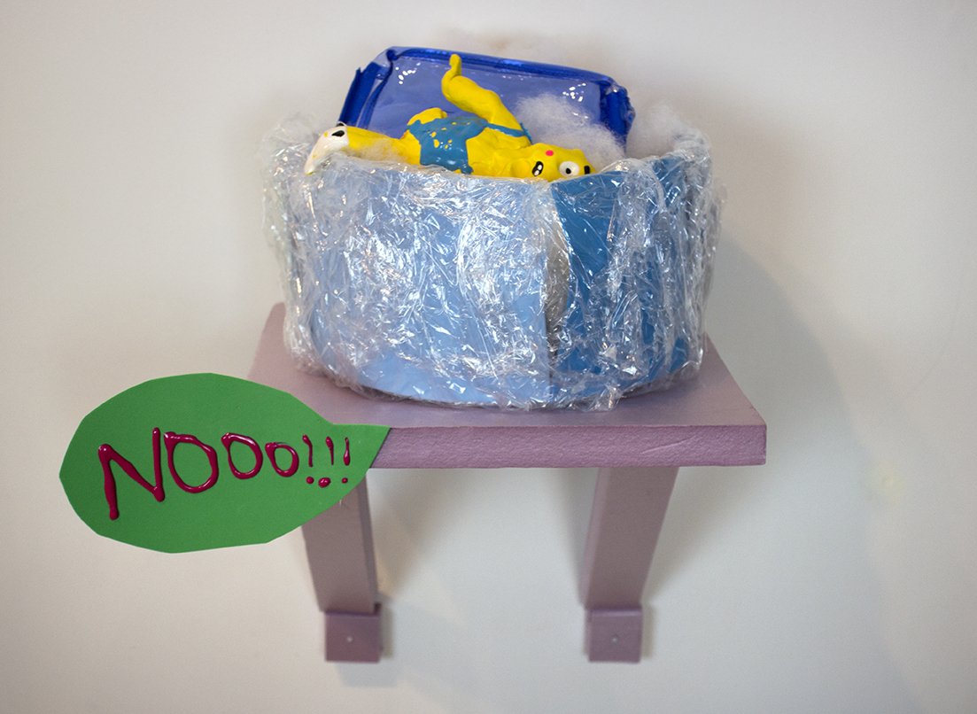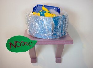 Saran wrap, foam paper, puffy paint, magic clay, plastic, cotton stuffing, insulation foam, 9 x 10 x 8″