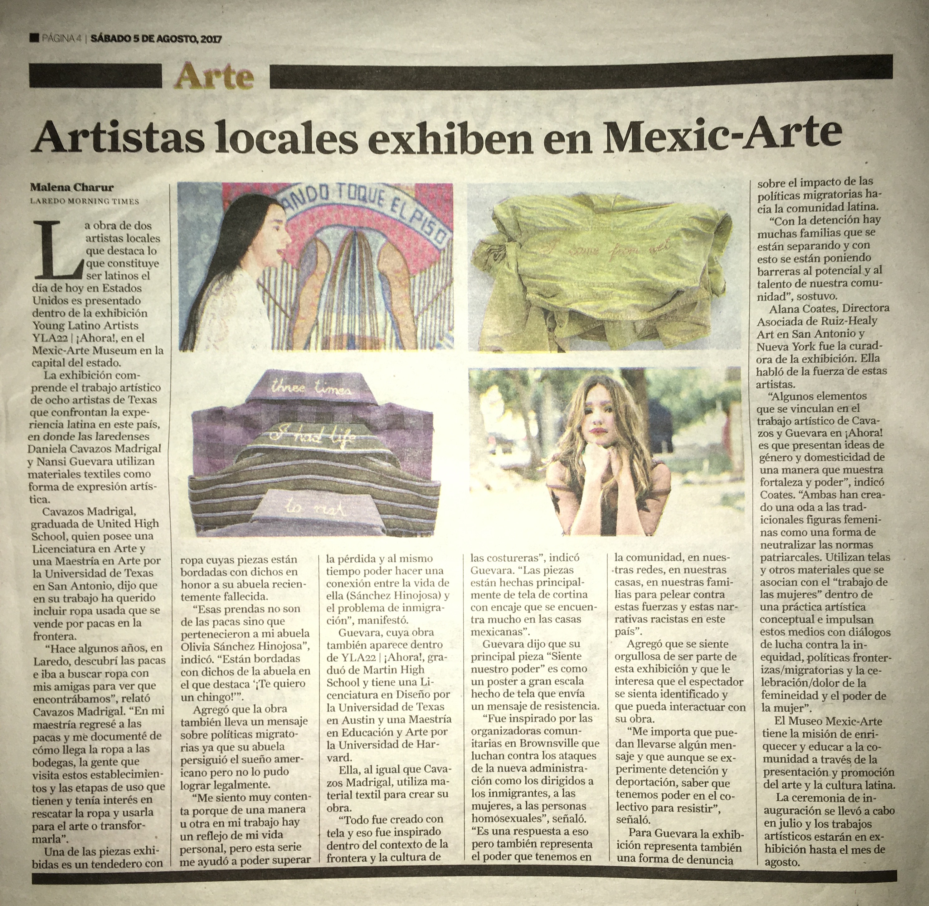 Charur, Malena. “Artistas locales exhiben en Mexic-Arte” Laredo Morning Times, August 5, 2017.