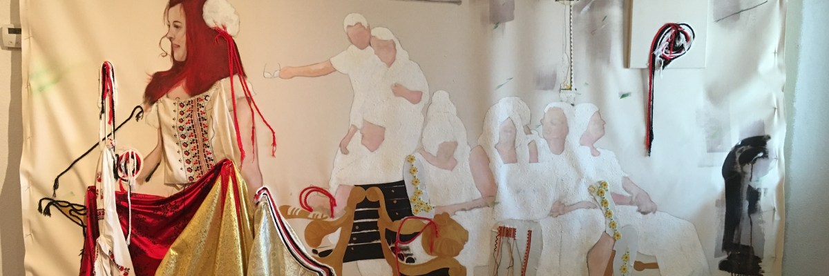 Mira Hnatyshyn Studio Visit August 3, 2017 When visiting the studio of Mira Hnatyshyn, the first artwork encountered is a large mixed-media on raw canvas. Hanging in the fashion of a tapestry, the work tackles the Texas-based artist’s Ukrainian heritage. Hnatyshyn says its title, The Braidbasket, is a word-play from the Ukraine nickname as the “bread basket of Europe.” Previously shown at Bluestar Contemporary Museum in 2014, this work is based off of a photograph the artist took while traveling to the country just before the Maidan Revolution that same year. The artist said that she photographs tirelessly on her…